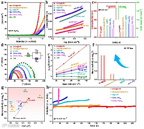 图4. IrCo@TiN、未负载IrCo合金、Ir@TiN、商用IrO2、商用RuO2和TiN在0.5 M H2SO4溶液中对OER的电催化性能。(a) iR校正的LSV极化曲线。(b)塔菲尔斜率。(c)电流密度为10 mA cm−2时的过电位(左)和塔菲尔斜率(右)的比较。(d) EIS谱图。(e)计算的Cdl值。(f) 1.53 V vs. RHE下的质量活性。(g)质量活性和TOF与文献报道的比较。(h) 计时电位测试曲线。