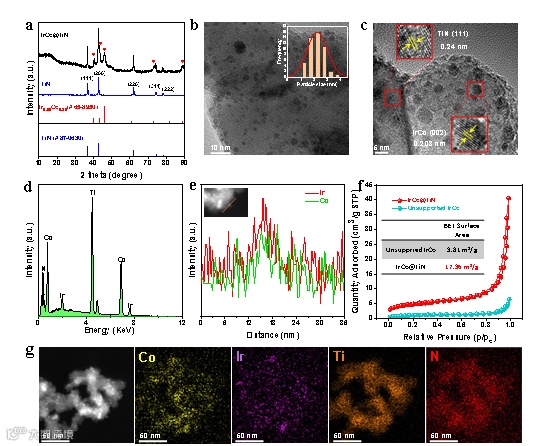 图2. IrCo@TiN催化剂的结构和组成表征。(a) XRD图谱。(b) TEM图像。(c) HR-TEM图像。(d) EDX能谱。(e) IrCo@TiN EDS线扫描图。(f) IrCo@TiN和IrCo合金的BET测试。(g) IrCo@TiN HAADF-STEM图像和相应的EDS元素映射图像。