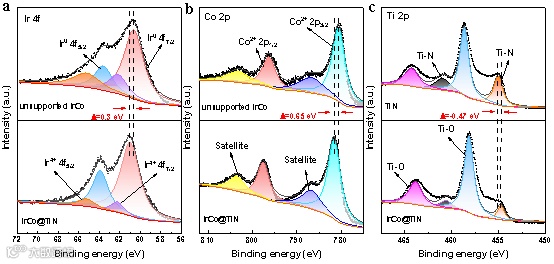 图3. 未支撑IrCo合金、TiN和IrCo@TIN的XPS 谱图。(a) Ir 4f, (b) Co 2p, (c) Ti 2p。
