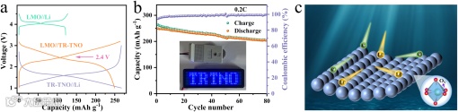 图6.(a)LMO//Li、TR-TNO//Li和LMO//TR-TNO电池在0.2 C下的充放电曲线;(b)全电池LMO//TR-TNO在0.2 C下的循环性能。(c)介孔TR-TNO样品中锂离子和电子的传输路径图。