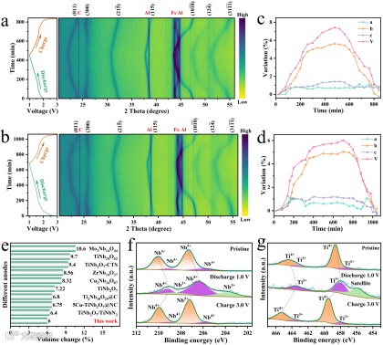 图5.(a)TNO和(b)TR-TNO在首次循环过程中的原位XRD图谱。(c)TNO和(d)TR-TNO的晶胞参数变化。(e)TR-TNO与先前报道的Nb基负极材料的体积变化比较。TR-TNO电极在不同电压下的(f)Nb 3d和(g)Ti 2p高分辨XPS谱图
