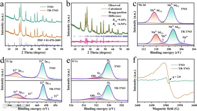 图2.(a)TNO和TR-TNO的XRD图谱。(b)TR-TNO的Rietveld精修XRD图谱。(c)Nb 3d,(d)Ti 2p,(e)O 1s的高分辨XPS图谱。(f)TNO和TR-TNO的EPR图谱。
