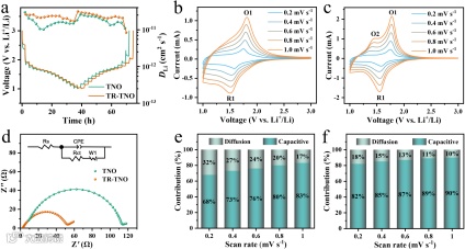 图4.(a)TNO和TR-TNO电极的GITT曲线及对应的Li+扩散系数。(b)TNO和(c)TR-TNO电极在不同扫速下的CV曲线。(d)TNO和TR-TNO电极的Nyquist图。(e)TNO和(f)TR-TNO电极在不同扫速下的电容贡献。