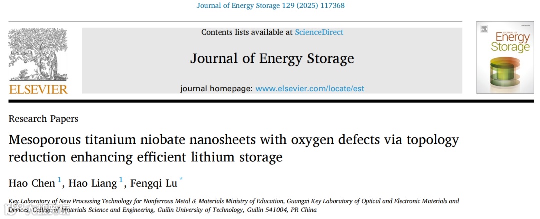 近日,桂林理工大学卢锋奇博士团队在Journal of Energy Storage期刊发表题为“Mesoporous titanium niobate nanosheets with oxygen defects via topology reduction enhancing efficient lithium storage”的研究论文。该论文通过溶剂热反应、热处理和拓扑还原制备了具有氧空位的介孔TiNb2O7纳米片(TR-TNO)。研究表明,氧空位的引入显著增强了材料的电子电导率。得益于介孔纳米片结构、氧空位以及Ti3+/Ti4+、Nb3+/Nb4+和Nb4+/Nb5+氧化还原电对的协同作用,TR-TNO电极表现出优异的储锂性能,包括优异的倍率性能(20 C时为166 mAh g-1)和循环性能(在5 C下循环1000次后容量保持率为90%)。此外,原位X射线衍射证实了TR-TNO在锂化和脱锂过程中具有良好的结构稳定性,最大体积变化仅为6%。同时,由商业LiMn2O4正极和TR-TNO负极组装的全电池在0.2 C下循环80次后仍表现出202.7 mAh g-1的可逆容量。在这项工作中,通过拓扑还原引入氧空位的方法为其他氧化物负极材料提供了新的见解。