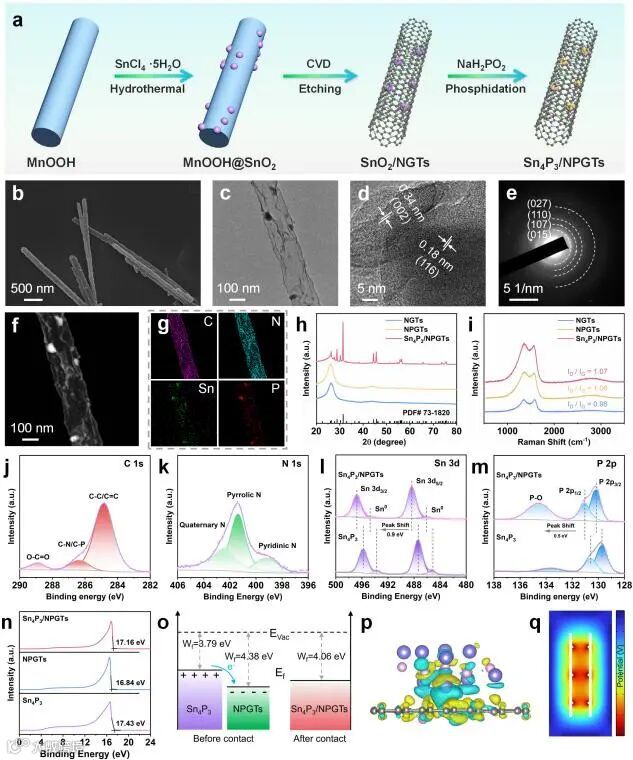 图1. Sn₄P₃/NPGTs异质结的合成策略和结构表征