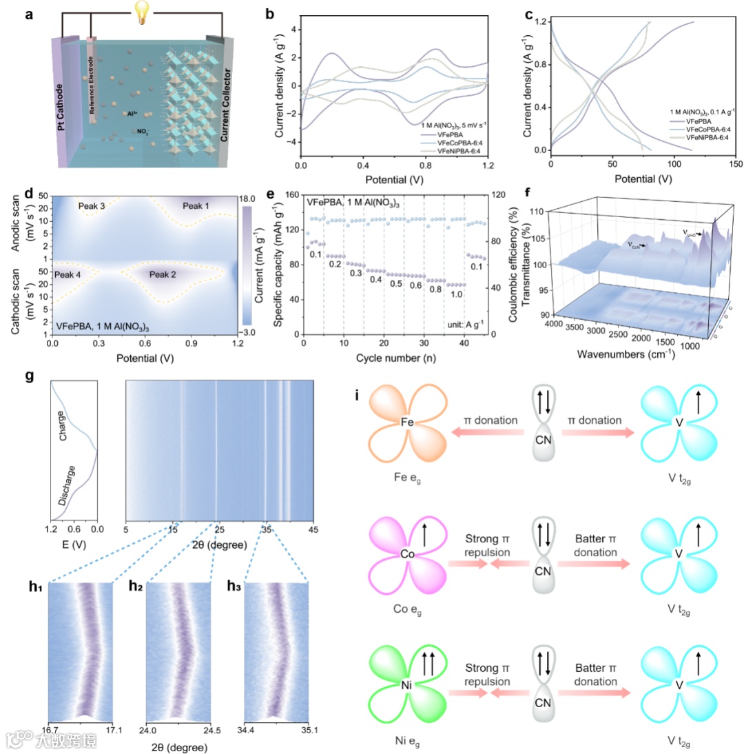 图3. 水系电解液中的电化学性能:(a) 三电极体系构型示意图。(b) 不同元素样品的CV曲线。(c) 不同元素样品的充放电曲线。(d) VFePBA在不同扫描速率下的CV曲线。(e) VFePBA倍率性能。(f) VFePBA在1 M Al(NO3)3电解液中的原位FTIR光谱。(g) VFePBA在1 M Al(NO3)3电解液中的原位XRD图谱及对应充放电曲线。(h1-h3) 原位XRD图谱局部放大区域。(i) 金属间电子相互作用机制示意图。