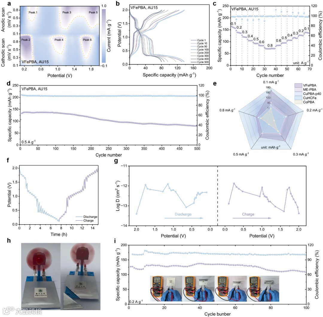 图4. AU15电解液中的电化学性能:(a) VFePBA在不同扫描速率下的CV曲线。(b) VFePBA的充放电曲线。(c) 不同扫描速率下VFePBA的电容贡献率。(d) VFePBA长循环性能。(e) VFePBA倍率性能。(f) VFePBA恒电流间歇滴定曲线。(g) 基于GITT计算的 VFePBA离子电导率。(h) VFePBA软包电池展示。(i) VFePBA软包电池的长循环性能及不同弯曲角度下的电压变化。