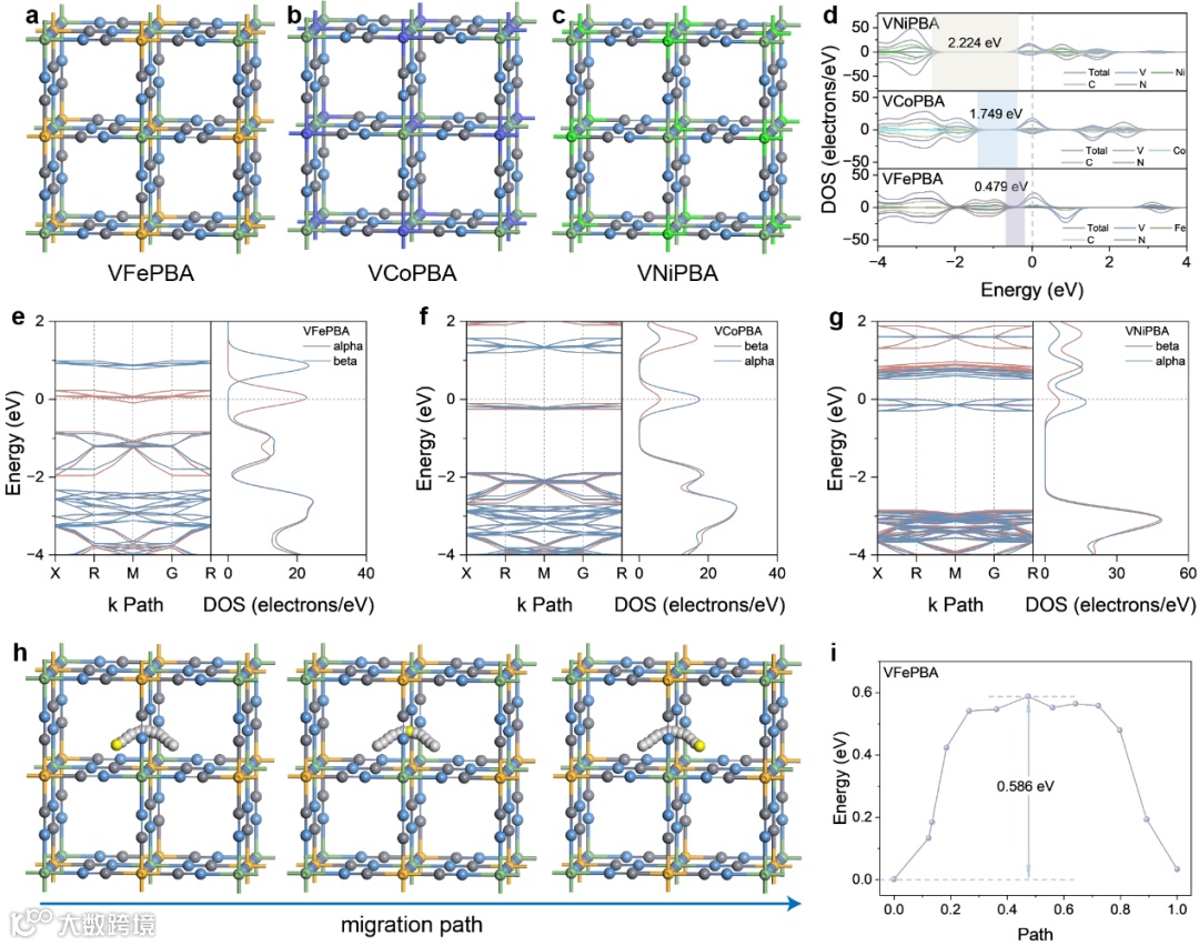 图5. (a) VFePBA结构示意图。(b) VCoPBA结构示意图。(c) VNiPBA结构示意图。(d) VFePBA、VCoPBA与VNiPBA的态密度对比图。(e) VFePBA能带结构图。(f) VCoPBA能带结构图。(g) VNiPBA能带结构图。(h) VFePBA中Al3+迁移路径。(i) VFePBA中Al3+迁移能垒。