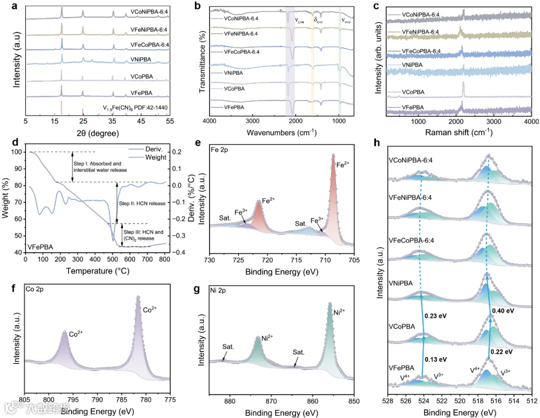 图2. (a) XRD图谱。(b) FTIR光谱。(c) Raman光谱。(d) VFePBA热重曲线。(e) VFePBA的Fe 2p XPS能谱。(f) VCoPBA的Co 2p XPS能谱。(g) VNiPBA的Ni 2p XPS能谱。(h)V-PBAs的V 2p XPS能谱。