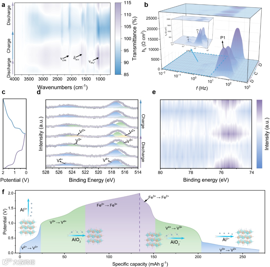 原位红外光谱揭示充放电过程中SO42-(~1200 cm-1)和N-H(~1750 cm-1)特征峰的可逆强度变化,证实离子簇迁移及初始循环形成含硫/氮自限制性CEI层(增强界面稳定性)。原位阻抗DRT分析识别三阶段动力学特征:放电前期(2.0-0.7V)界面阻抗(RCEI)、电荷转移阻抗(Rct)和固态扩散(Wdiff)增大,末期(0.7-0.1V)降低。非原位XPS结合DFT计算表明A3+通过形成Al-O复合物。钒的氧化态在循环中呈现阶段性演变:放电I阶段钒氧化态变化极小,II阶段从V4+还原至V3+,III阶段进一步还原至V2+;充电过程则发生逆向氧化。该行为与CV氧化还原峰吻合,证实低电位区存在V4+/ V3+和V3+/ V2+⁺电对,高电位区存在Fe3+/Fe2+电对。