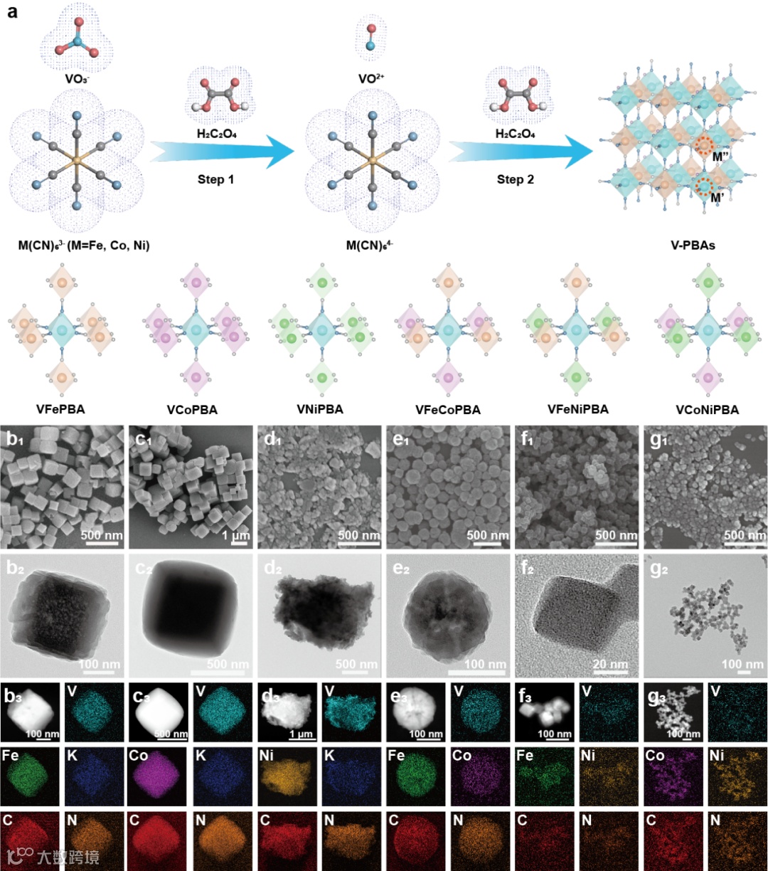 图1. (a) 合成路径与结构示意图。(b1-b3) VFePBA,(c1-c3) VCoPBA,(d1-d3) VNiPBA,(e1-e3) VFeCoPBA,(f1-f3) VFeNiPBA,(g1-g3) VCoNiPBA的扫描电镜、高分辨透射电镜、暗场像及元素分布图。