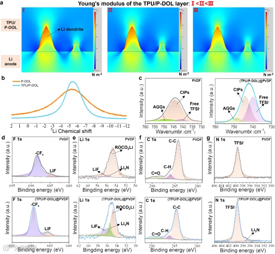 图5. (a) Li/(TPU/P-DOL)界面压力分布的COMSOL模拟图;(b) P&M和TPU/P-DOL固化层的⁷Li固态核磁共振谱图;(c) PVDF固态电解质与TPU/P-DOL固化层的拉曼光谱;(d)–(g)循环后锂金属负极表面分别采集的XPS谱图:(d) F 1s,(e) Li 1s,(f) C 1s 和 (g) N 1s。