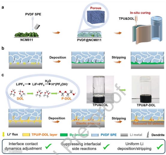 图1. 原位固化超薄TPU/P-DOL界面层的制备过程及提升界面稳定性机理示意图。