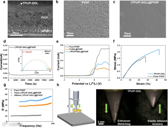 图3. (a) 去除锂负极后的Li||NCM811电池的SEM图像;(b) 涂覆TPU/P-DOL层前的PVDF SSE表面SEM图像;(c) 涂覆TPU/P-DOL层后的PVDF SSE表面SEM图像;(d) (TPU/P-DOL)@PVDF电解质的离子迁移数测试结果;(e) PVDF电解质与(TPU/P-DOL)@PVDF电解质的LSV曲线;(f) PVDF膜与TPU/P-DOL膜的应力-应变测试曲线;(g) 涂覆不同厚度TPU/P-DOL层的PVDF电解质的DMA测试结果;(h) TPU/P-DOL膜的弹性-机械性能测试装置及其光学图像。