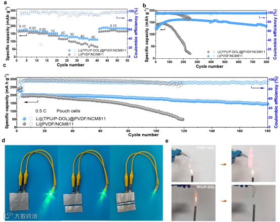 图4. (a) Li||NCM811电池的倍率性能;(b) Li||NCM811纽扣电池在1C倍率下的长循环性能;(c) Li||NCM811软包电池在1C倍率下的长循环性能;(d) 匹配有TPU/P-DOL界面层的软包电池的安全性测试;(e) TPU/P-DOL固化界面层与PVDF SSE的可燃性测试。