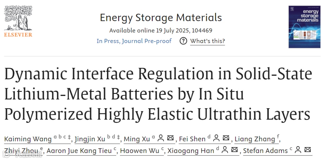 近日,来自西安理工大学的王凯铭、徐鸣与西安交通大学韩晓刚、沈飞以及新加坡国立大学的Stefan Adams合作,在国际权威期刊《Energy Storage Materials》上发表题为"Dynamic Interface Regulation in Solid-State Lithium-Metal Batteries by In Situ Polymerized Highly Elastic Ultrathin Layers"的研究论文。该研究创新性地提出通过原位聚合含热塑性聚氨酯的1,3-二氧戊环以构建高弹性界面层(TPU&P-DOL),有效解决了PVDF基准固态电解质在锂金属电池中的界面不稳定难题。