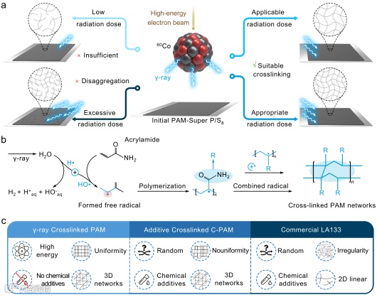 创新性的将核技术(γ射线辐照)的应用拓展至电化学储能领域,突破了传统交联型粘结剂合成方法在粘结网络结构可控性、均匀性和纯净度方面的限制,成功实现了硫正极粘结剂的原位构建。该方法无需添加任何化学助剂,仅通过高能γ射线辐照即可引发丙烯酰胺单体的自由基聚合与交联反应;同时,通过精确调控γ射线的辐照剂量即可实现对粘结剂网络结构的精准可控合成。先分散后原位聚合与交联的方式,进一步确保了粘结剂网络结构的均匀性。