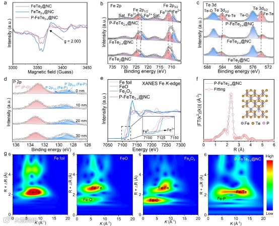 图3. 结构表征。a) FeTe2@NC、FeTe2-x@NC和P-FeTe2-x@NC的EPR谱。b) Fe 2p和c) Te 3d的高分辨率XPS谱。d)P-FeTe2-x@NC经Ar+刻蚀至0、10、20和30 nm深度后采集的P 2p XPS谱。e)P-FeTe2-x@NC和参考样品的Fe K边XANES谱。f) P-FeTe2-x@NC的FT-EXAFS谱及拟合曲线。g) Fe箔、FeO、Fe2O3和P-FeTe2-x@NC的小波变换(WT)-EXAFS等高线图。
