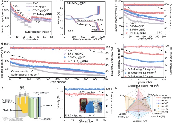 图8. 不同正极Li-S电池的综合电化学评估。a) 0.1至3 C的倍率性能。b) S/P-FeTe2-x@NC基Li-S电池在0.2 C下的恒电流充放电曲线。c) 0.5 C下的循环性能。d) 1 C下的长循环性能。e) 贫电解质条件下的高硫负载性能。f) 柔性软包电池结构示意图。g) S/P-FeTe2-x@NC基软包电池的循环性能(插图:软包电池的开路电压)。h) 与先进系统关键性能指标的雷达图对比。
