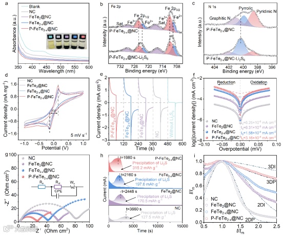 图4. 吸附-催化机理。a) NC、FeTe2@NC、FeTe2-x@NC和P-FeTe2-x@NC吸附后Li2S6溶液的紫外-可见吸收光谱(插图:光学吸附图像)。b) 高分辨率Fe 2p和c) N 1s XPS谱,显示P-FeTe2-x@NC在Li2S6吸附前后的变化。d) Li2S6对称电池在5 mV s-1下的CV曲线。e) CA曲线、f) Tafel图和g) Li2S6对称电池的EIS谱(插图:等效电路)。h) 不同催化剂上Li2S成核的恒电位放电曲线。i) 与理论成核模型对应的无量纲瞬态曲线。