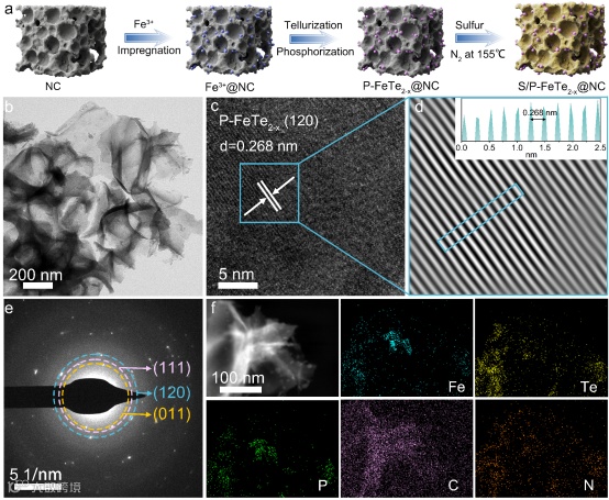 基于前述理论设计,本研究成功制备了氮掺杂碳(NC)负载的P-FeTe2-x纳米团簇复合材料(P-FeTe2-x@NC)。该材料呈现分级多孔结构,由三维互联的超薄碳纳米片构成,P-FeTe2-x纳米颗粒均匀分散于碳骨架表面(图2a)。该结构不仅有利于硫的负载和体积膨胀缓冲,还提供了多尺度离子传输通道,协同促进锂离子迁移与电解液渗透,并借助导电骨架实现多硫化物的物理限域和化学吸附。扫描电镜(SEM)和透射电镜(TEM)分析表明,P-FeTe2-x@NC保持了良好的多孔框架和分散性。高分辨TEM图像显示出晶面间距为0.268 nm的清晰晶格条纹,对应于FeTe2的(120)晶面(图2c)。经逆傅里叶变换(IFFT)进一步证实其具有高度有序的晶格结构(图2d)。选区电子衍射(SAED)图谱中出现分别对应(111)、(120)和(011)晶面的衍射环,表明材料具有多晶性质(图2e)。此外,能量色散X射线(EDX)元素mapping显示Fe、Te、P、C和N元素在材料中均匀分布(图2f),证明了P的成功掺杂和纳米颗粒的良好分散性。