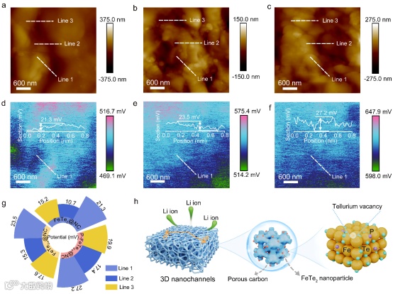 图7. KPFM分析和多硫化物调控机制。a-c) FeTe2@NC、FeTe2-x@NC和P-FeTe2-x@NC的AFM图像。d-f) 表面电势分布。g) 表面电势值的统计比较。h) P-FeTe2-x@NC在多硫化物锚定-转化-再利用循环中的协同机制示意图。