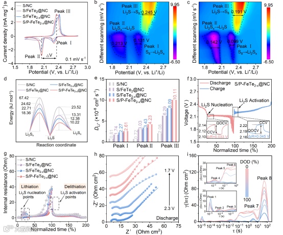 图5. SRR增强机制的验证。a) 不同正极在0.1 mV s-1下的CV曲线。b) S/FeTe2@NC和c) S/P-FeTe2-x@NC正极的CV等高线图。d) 由Arrhenius图得出的氧化还原反应活化能分布。e) S/NC、S/FeTe2@NC、S/FeTe2-x@NC和S/P-FeTe2-x@NC正极的锂离子扩散系数()。f) S/P-FeTe2-x@NC正极的GITT曲线。g) 不同正极的内阻随归一化时间的演变。h) S/P-FeTe2-x@NC在不同放电状态下的原位EIS图。i) 基于放电过程中采集的EIS进行的弛豫时间分布(DRT)分析。