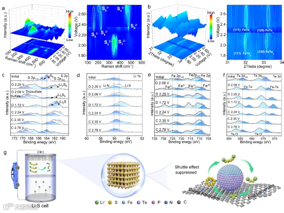 图9. P-FeTe2-x@NC催化调控LiPSs转化的机理研究。a) S/P-FeTe2-x@NC正极在不同充放电状态下的非原位拉曼光谱。b) 非原位XRD谱。c) S 2p、d) Li 1s、e) Fe 2p和f) Te 3d的非原位XPS谱。g) S/P-FeTe2-x@NC的协同机制示意图。