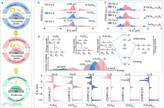 图1. P-FeTe2-x的机理和电子结构分析。a) 不同催化剂表面的催化行为比较。b) FeTe2、FeTe2和P-FeTe2-x相对于费米能级的d带中心。c) FeTe2、FeTe2-x和P-FeTe2-x中Fe-d轨道与Li2S6中S-p轨道的分态密度(PDOS)。d) 晶体场调制的d-p轨道杂化。e) Fe-S耦合和S-Li耦合的晶体轨道哈密顿布居(COHP)分析。
