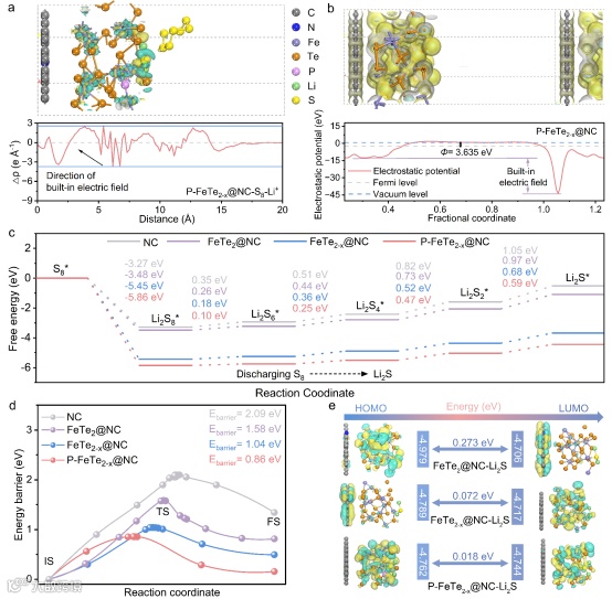 图6. 催化剂-多硫化物相互作用的原子级探究。a) P-FeTe2-x@NC-S8-Li+体系的电荷密度差和平均电子转移量。b) P-FeTe2-x@NC的静电势分布计算。c) 不同基底上硫还原过程的吉布斯自由能变化。d) 不同催化剂上Li2S分解的能垒。e) 催化剂-Li2S6复合物中的前沿轨道能级对齐。