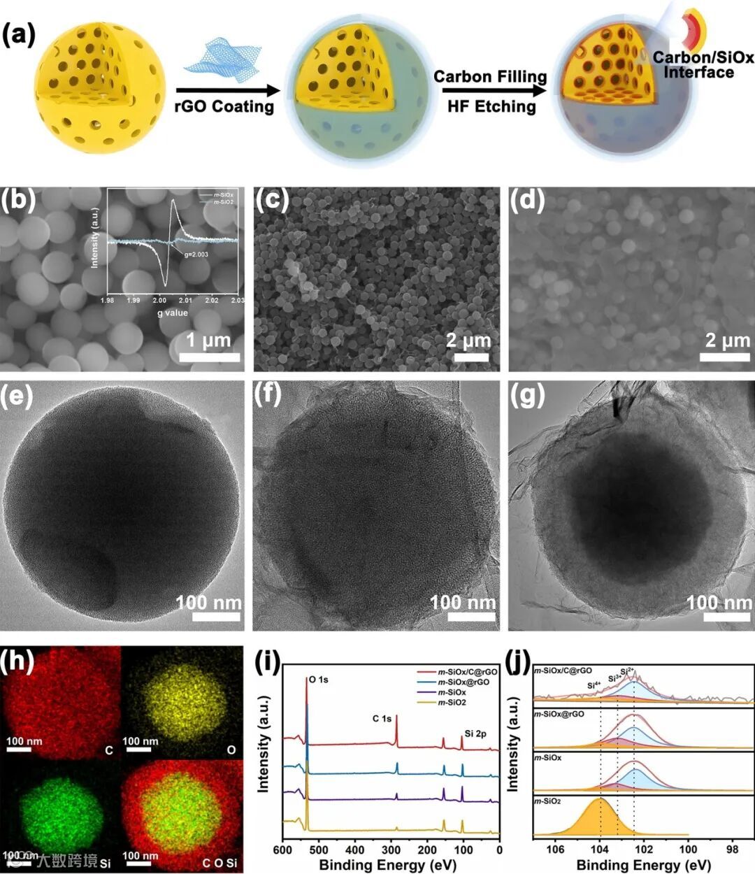 图1. (a) m-SiOₓ/C@rGO的制备过程示意图;(b)-(d) m-SiOₓ、m-SiOₓ@rGO和m-SiOₓ/C@rGO的SEM图像;(e)-(g) 对应样品的TEM图像;(h) m-SiOₓ/C@rGO的TEM-EDS元素分布图;(i-j) m-SiO₂、m-SiOₓ、m-SiOₓ@rGO和m-SiOₓ/C@rGO的XPS谱图及高分辨率Si 2p XPS光谱;图(b)插图:m-SiO2和m-SiOx的EPR光谱。