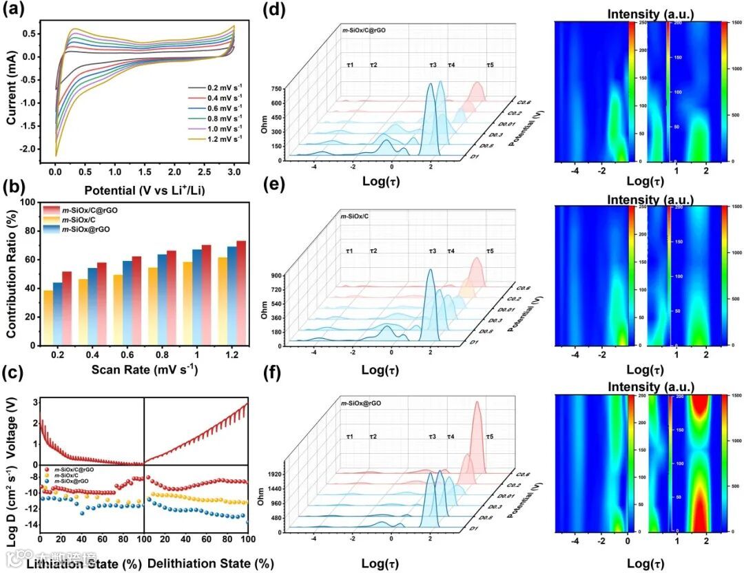图3. (a) m-SiOx/C@rGO电极在0.2至1.2 mV s−1扫描速率范围内的循环伏安(CV)曲线。(b) 不同扫描速率下电容贡献占比分析及(c) m-SiOx/C@rGO、m-SiOx/C和m-SiOx@rGO电极的恒电流间歇滴定技术(GITT)曲线及其对应的锂离子扩散系数。(d-f) 三组电极的分布弛豫时间(DRT)曲线及其等高线图。