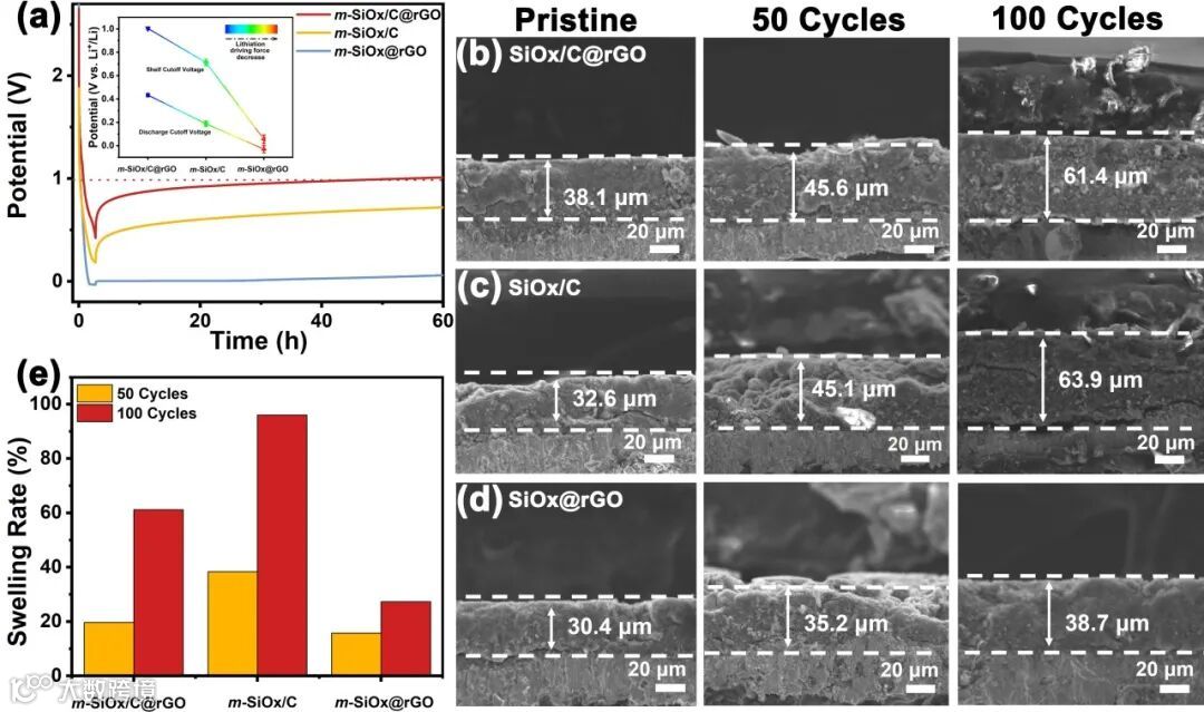 图4. (a) m-SiOx/C@rGO、m-SiOx/C和m-SiOx@rGO电极体系的电势分布特性。图a插图:静置时间-电势变化曲线。(b-d)三组电极在0.5 A g−1电流密度下循环前/后的截面SEM形貌对比(依次对应m-SiOx/C@rGO、m-SiOx/C和m-SiOx@rGO体系)。(e)基于循环前后电极厚度变化计算的膨胀率统计柱状图。