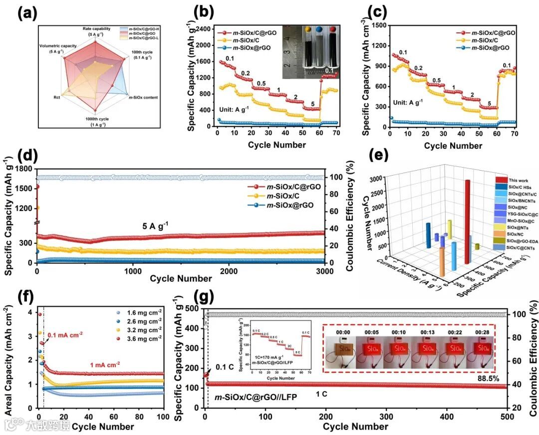 图2. (a)不同SiOx含量m-SiOx/C@rGO电极性能对比雷达图。(b)-(c) m-SiOx/C@rGO、m-SiOx/C及m-SiOx@rGO电极的倍率性能(图b插图为三组复合材料等质量实物对比光学照片)。(d)电极在5 A g−1电流密度下的长循环稳定性。(e) m-SiOx/C@rGO电极与文献报道负极材料的电化学性能对比。(f)不同载量m-SiOx/C@rGO负极在1 mA cm−2电流密度下面容量随循环次数的演变(前三圈活化采用0.1 mA cm−2)。(g) m-SiOx/C@rGO//LFP全电池在1 C倍率下的循环稳定性(图g插图为全电池倍率性能及驱动LED灯组的光学照片)。