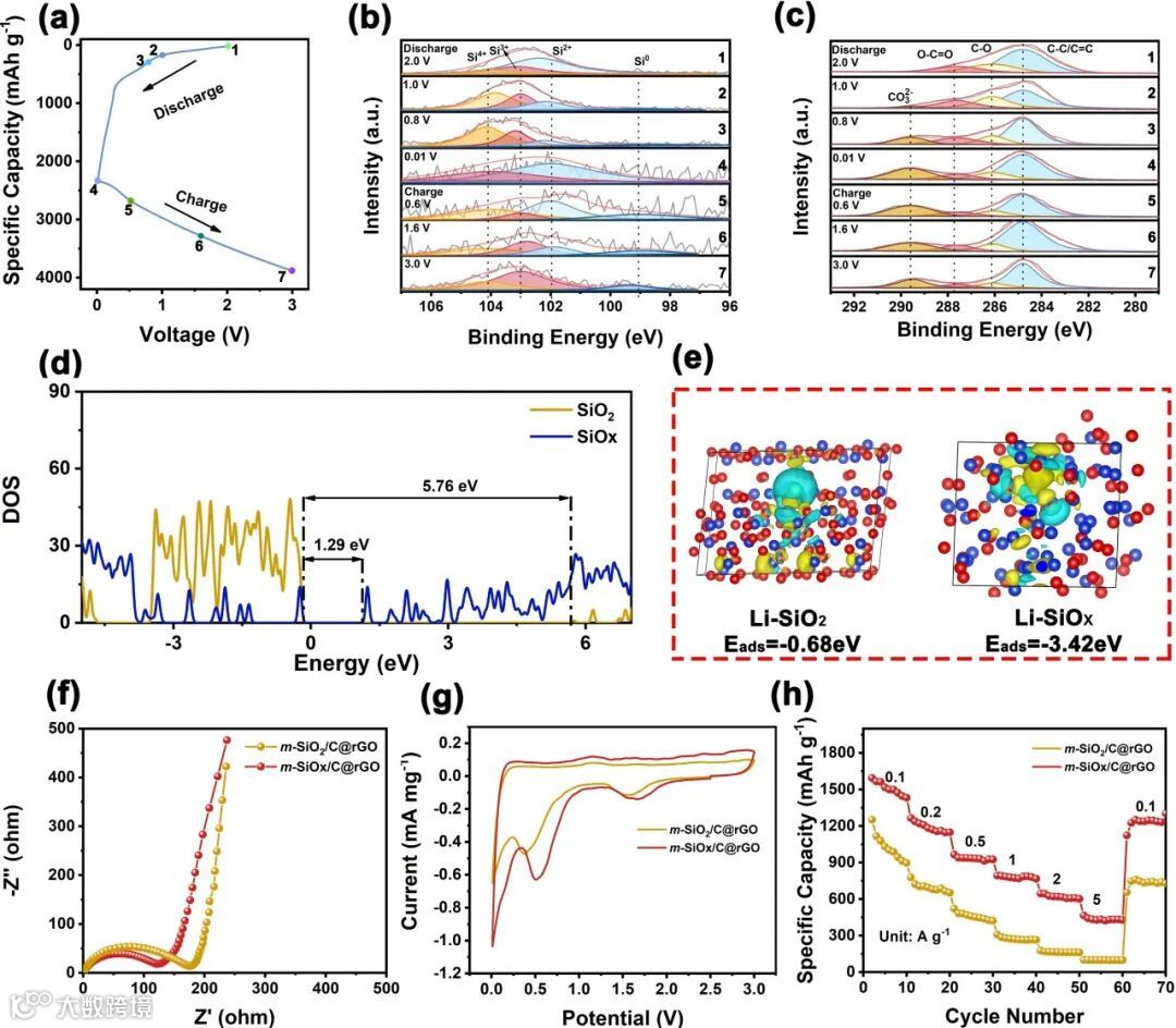 图5. (a) m-SiOx/C@rGO电极在0.1 A g−1电流密度下的恒电流充放电(GCD)曲线。(b)-(c) 非原位高分辨XPS光谱分析:(b)Si 2p轨道与(c)C 1s轨道的化学态演变。(d) SiO2与SiOx材料的态密度(DOS)谱对比。(e) 锂原子在SiO2和SiOx界面处的结合能理论计算结果。锂离子半电池体系中m-SiOx/C@rGO与m-SiO2/C@rGO电极的电化学性能对比:(f)循环后电极的奈奎斯特(Nyquist)阻抗谱;(g)首圈循环伏安(CV)曲线;(h)不同电流密度下的倍率性能演变。