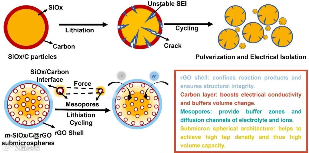 近日,河北工业大学材料科学与工程学院王恭凯与张程伟研究员团队在锂离子电池负极材料领域取得重要进展。研究者提出一种基于溶胶-凝胶法结合包覆工艺的可控制备策略,成功构建了还原氧化石墨烯(rGO)球壳封装的介孔SiOx/C复合亚微球(m-SiOx/C@rGO)。通过系统调控实验参数,实现了复合材料中SiOx含量的精准调控,其结构优势具体表现为:(1)rGO球壳作为亚微米级反应腔室,有效限制活性物质体积膨胀并增强电极结构稳定性;(2)SiOx与碳基体形成紧密异质界面,显著提升电子传导效率并协同抑制充放电过程中的应力集中;(3)内部贯通介孔网络促进电解液渗透与锂离子快速传输,同时亚微米级球形形貌通过高密度有序堆积显著提升体积容量。借助密度泛函理论(DFT)计算,研究团队进一步揭示了氧空位缺陷通过降低材料带隙和增强锂吸附能协同优化储锂动力学的内在机制。电化学测试表明,优化后的m-SiOx/C@rGO负极展现出卓越性能:在0.1 A g−1电流密度下实现1049.6 mAh cm−3的体积容量,较传统石墨电极(570 mAh cm−3)提升近两倍;在5 A g−1高倍率下经3000次循环后仍保持456.9 mAh g−1的可逆容量,容量保持率达83.5%,显著优于文献报道的同类体系。组装的磷酸铁锂(LFP)全电池在1 C倍率下循环500次后容量保持率为88.5%(108.1 mAh g−1),初始库伦效率高达89.3%。该研究通过多尺度结构设计与理论模拟的深度结合,为发展高体积容量、长循环稳定性的新型锂离子电池负极材料提供了解决方案,对推进高能量密度储能器件的工程化应用具有重要意义。