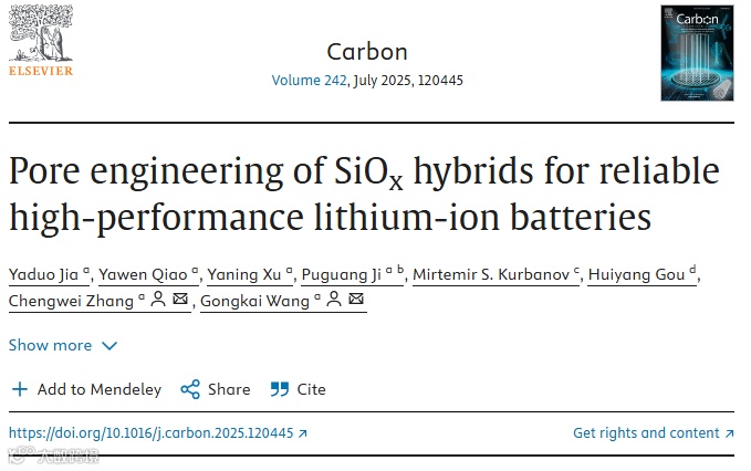 相关成果以 “Pore Engineering of SiOx Hybrids for Reliable High-Performance Lithium-Ion Batteries”为题发表在《Carbon》上(https://doi.org/10.1016/j.carbon.2025.120445)上。河北工业大学硕士贾亚夺为第一作者。