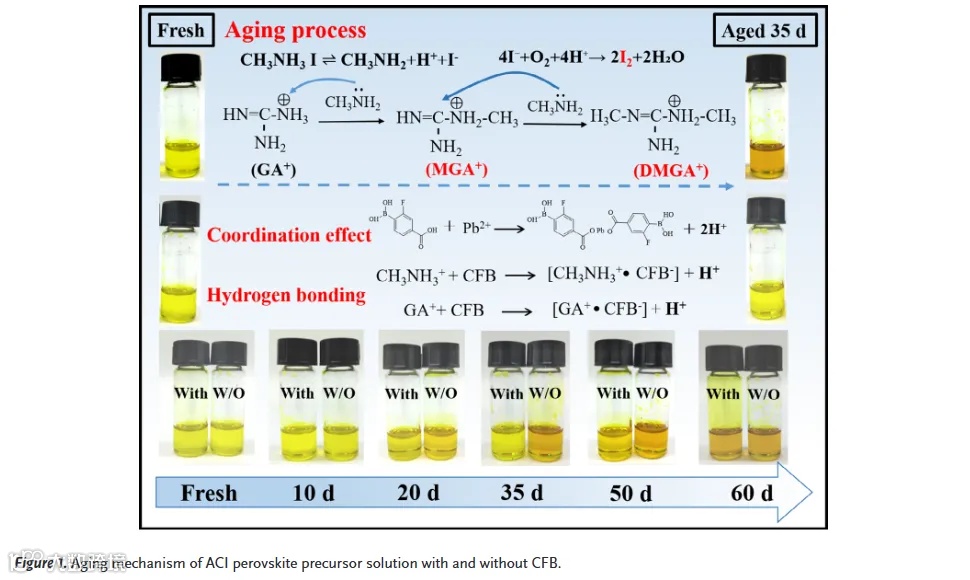 近日,南昌大学胡婷和陈义旺等人在国际知名期刊Angew. Chem. Int. Ed.上发表题为“Dual-Functional Molecular Stabilization of Spacer Cation-Mediated Aging Dynamics in Low-Dimensional Perovskite Precursors Enables Efficient Solar Cells”的文章。该文章揭示了低维钙钛矿前驱体的内在老化机制,发现间隔阳离子的引入从根本上调控了分解动力学。该工作设计了一种双功能溶液稳定剂——4-羧基-2-氟苯硼酸(CFB),可同时抑制前驱体降解并调控结晶动力学。其羧基通过自发去质子化与胍盐(GA⁺)形成强氢键,有效抑制甲胺(MA⁰)介导的亲核攻击,阻止GA⁺与MA⁰之间的不可逆加成-消除反应。同时,CFB通过配位调控实现多阶段结晶控制,获得具有钝化晶界的高度取向钙钛矿晶体。优化后的器件表现出卓越的光伏性能,电压损失低至0.38 eV。