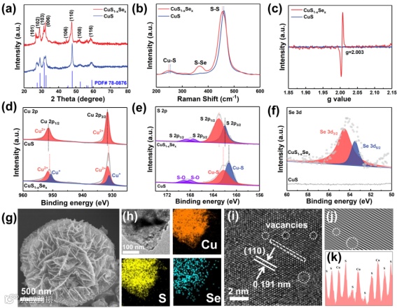 图1. CuS1-xSex和CuS的 (a) XRD、(b) 拉曼、(c) EPR、(d-f) XPS图谱。CuS1-xSex的 (g) SEM图像、(h) EDS元素分布图、(i-k) HRTEM图像。