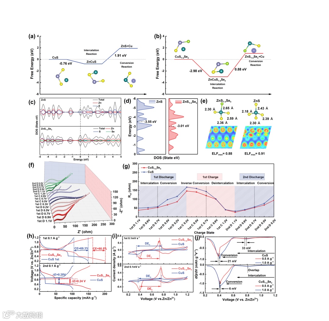 图4. (a) CuS与(b) CuS1-xSex的转化反应能垒,(c) ZnS与 ZnS1-xSex的态密度分布,(d) ZnS与ZnS1-xSex中的p带中心,(e) ZnS1-xSex与ZnS的ELF,(f) CuS1-xSex在不同充放电状态下的原位EIS曲线,(g) 原位EIS的各充电状态下Rct值对比, (h) CuS与CuS1-xSex在0.1 A g-1下的GCD曲线、(i) 0.1 mV s-1下的CV曲线、 (j) 在0.5和1.0 A g-1下的差分容量曲线。