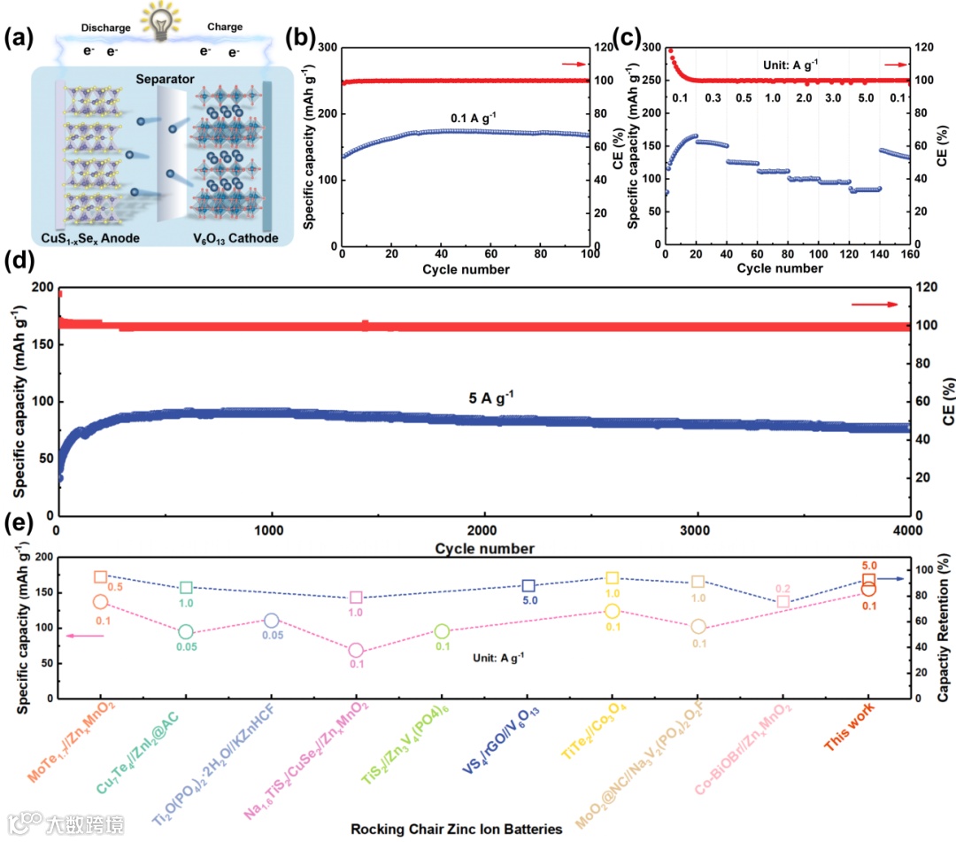 图6. (a) CuS1-xSex//V6O13全电池的示意图,(b) 0.1 A g-1条件下的循环稳定性,(c) 倍率性能,(d) 5.0 A g-1条件下的循环稳定性,(e) 本工作与先前报道的RCZIB电池的比容量及容量保持率对比。