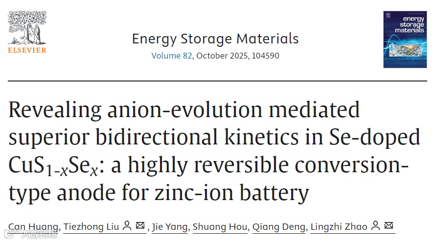近日,华南师范大学赵灵智团队,在国际知名期刊Energy Storage Materials上发表题为“Revealing anion-evolution mediated superior bidirectional kinetics in Se-doped CuS1-xSex: a highly reversible conversion-type anode for zinc-ion battery”的观点文章。该观点文章选择Se掺杂的转化型CuS(CuS1-xSex)负极为研究对象,揭示了掺杂的硒阴离子的演变及其对双向动力学的作用机制。具体来说,理论计算与实验结果表明硒掺杂通过提升电导率、优化Zn²⁺吸附行为及降低转化能垒,显著增强了CuS1-xSex的转化动力学。非原位表征揭示了硒阴离子的动态演变过程:在转化过程中,硒阴离子被纳入放电产物(ZnS1-xSex)中。这些掺入的硒阴离子通过协同效应增强充电过程中的逆向转化动力学:提升电导率、增强对铜吸附能力并促进ZnS1-xSex的分解。随后在逆转化过程中,硒阴离子可逆地重新掺入充电产物(CuS1-xSex)。得益于卓越的双向反应动力学特性,CuS1-xSex在半电池和全电池中均展现出优异的倍率性能及长期循环稳定性。本研究为阴离子掺杂转化型TMS负极在双向动力学中的动态演变及其协同增强机制提供了新见解。