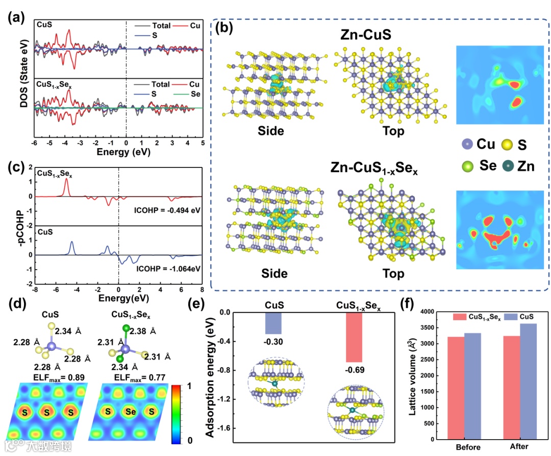 图2. (a) 态密度计算,(b) 吸附Zn²⁺时的电荷密度差侧视/顶视图及其切片映射,(c) 晶体轨道哈密顿分布,(d) 电子局域函数图,(e) CuS与 CuS1-xSex的吸附能比较,(f) Zn插入CuS与 CuS1-xSex时的晶格体积变化。
