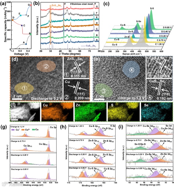 图3. (a) CuS1-xSex的GCD曲线及(b) 非原位XRD衍射图谱、(c) 拉曼光谱,CuS1-xSex在完全(d) 放电和(e) 充电状态下的HRTEM图像,(f) 完全放电状态下Cu、Zn、S和Se的元素映射图,CuS1-xSex的非原位XPS谱图:(g) Cu 2p,(h) S 2p,(i) Se 3d。