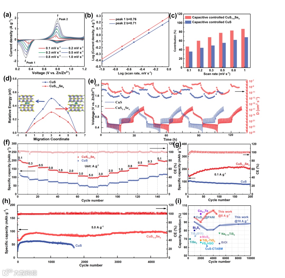 图5. (a) CuS1-xSex在不同扫描速率下的循环伏安曲线,(b) CuS1-xSex的峰值电流-扫描速率关系图,(c) CuS与CuS1-xSex的电容控制占比,(d) CuS与CuS1-xSex的Zn2+扩散能垒,(e) CuS1-xSex与CuS的GITT曲线及离子扩散系数,CuS与CuS1-xSex的(f) 倍率性能与在(g) 0.1 A g-1和(h) 5.0 A g-1条件下的循环性能,(i) CuS1-xSex与其他报道的RCZIB负极材料循环性能对比。