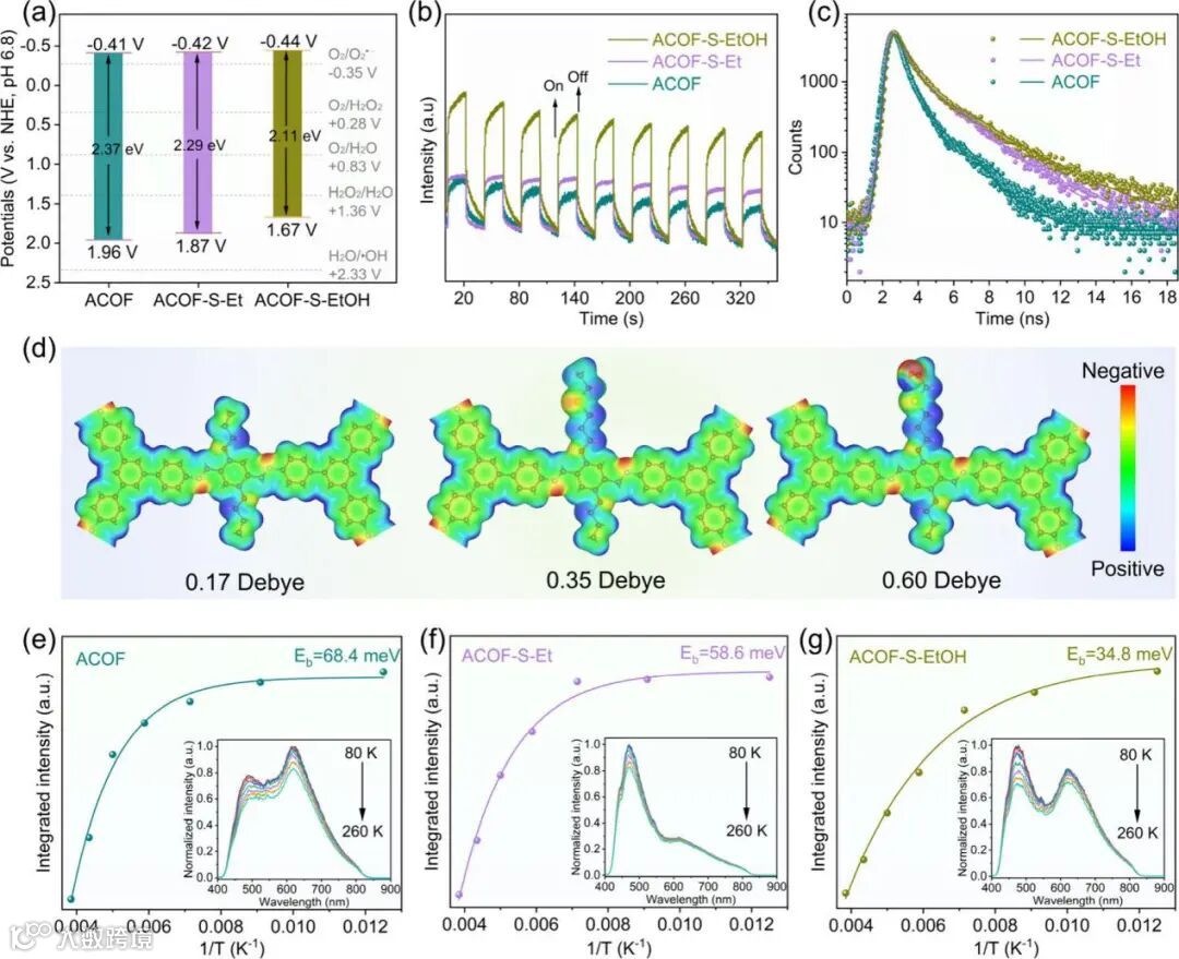 图4:(a) 催化剂的能带结构图;(b) 光电流响应;(c) 瞬态荧光光谱;(d) 表面静电势 (ESP) 图和偶极矩值;(e) ACOF, (f) ACOF-S-Et, (g) ACOF-S-EtOH的变温荧光光谱。