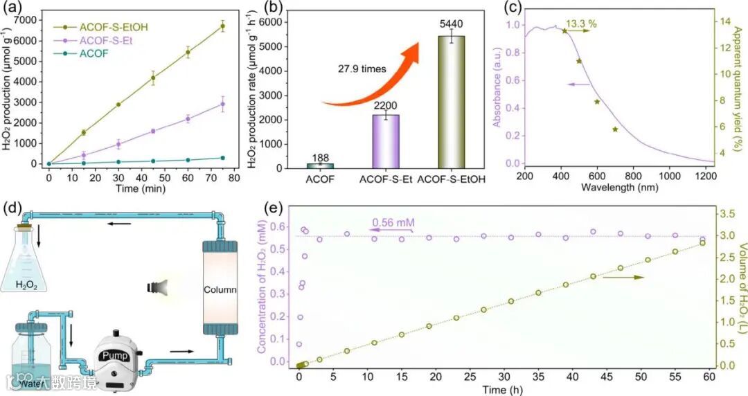图3:(a) 光催化H2O2产量随时间变化曲线;(b) 光催化H2O2生成速率对比;(c) ACOF-S-EtOH在不同波长下的表观量子产率(AQY);(d) 连续流光催化反应器装置示意图;(e) 流动反应器中H2O2的流出浓度和累积产量。