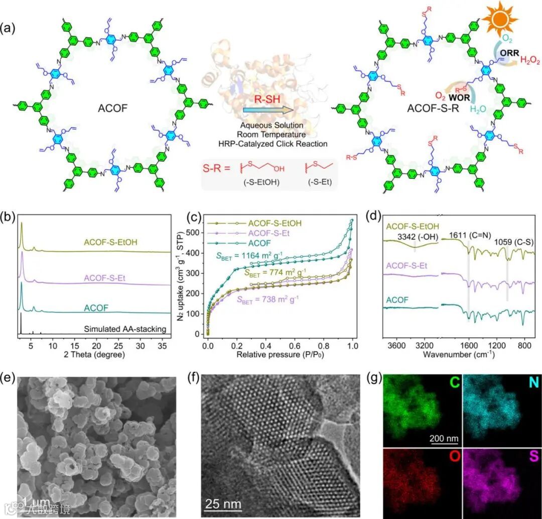 图1: (a) 通过酶点击反应将-S-EtOH和-S-Et基团引入COF的示意图;(b) ACOF、ACOF-S-Et和ACOF-S-EtOH的傅里叶变换红外光谱(FT-IR);(c) 上述三种材料的N2吸附-脱附等温线;(d) 上述三种材料的粉末X射线衍射(PXRD)图谱;(e) ACOF-S-EtOH的扫描电子显微镜(SEM)图像;(f) ACOF-S-EtOH的高分辨透射电子显微镜(HR-TEM)图像;(g) ACOF-S-EtOH中C、N、O和S元素的分布映射图。