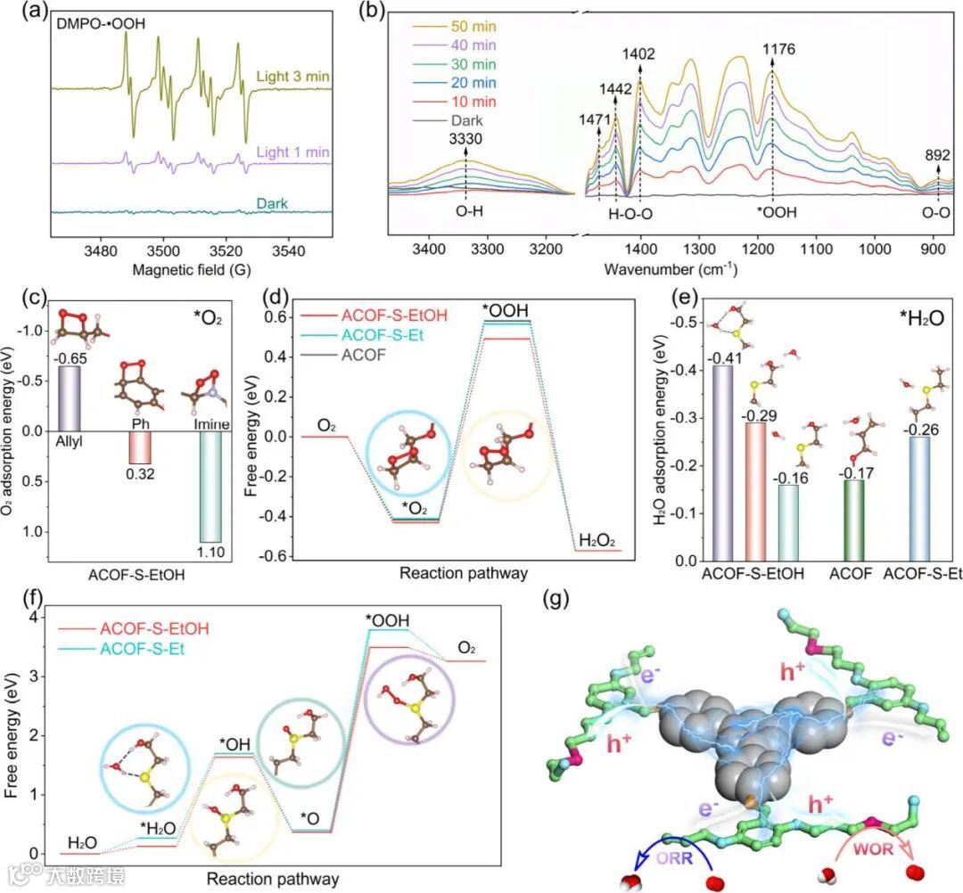 图5: (a) 光照下的原位EPR谱图;(b) 原位漫反射红外傅里叶变换光谱(DRIFTS);(c) O2在ACOF-S-EtOH不同位点上的吸附能;(d) 氧还原反应的吉布斯自由能图(pH = 7.0);(e) 不同位点上的水吸附能;(f) 水氧化反应(WOR)的吉布斯自由能图 (pH = 7.0);(g) 光催化反应机理示意图。