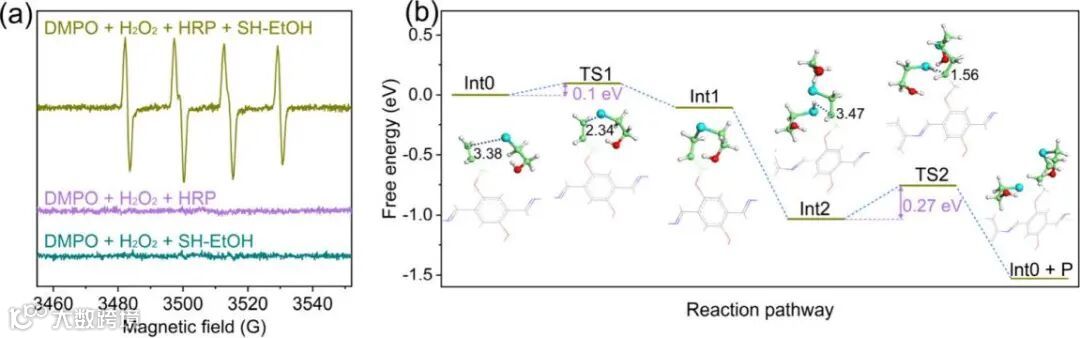 图2: (a) 使用DMPO捕获自由基的电子顺磁共振(EPR)谱图;(b) HRP催化点击反应的自由能图(DFT计算)。